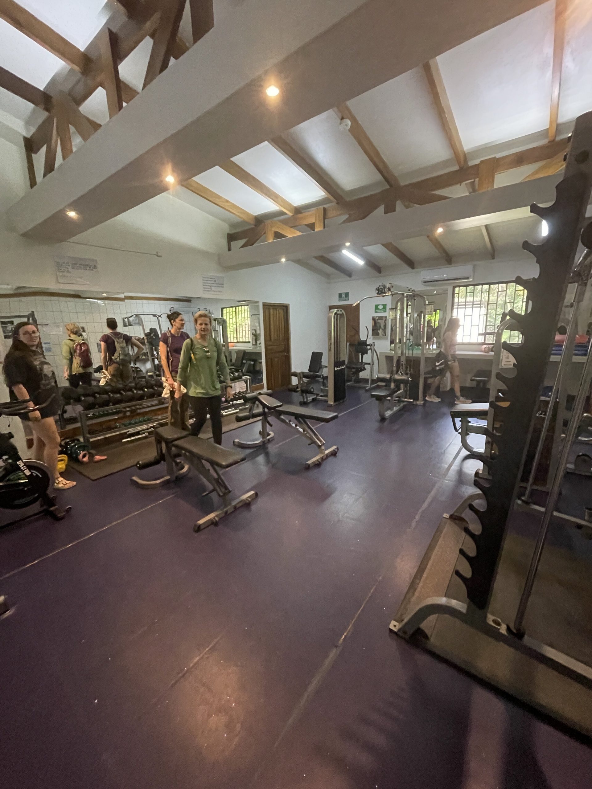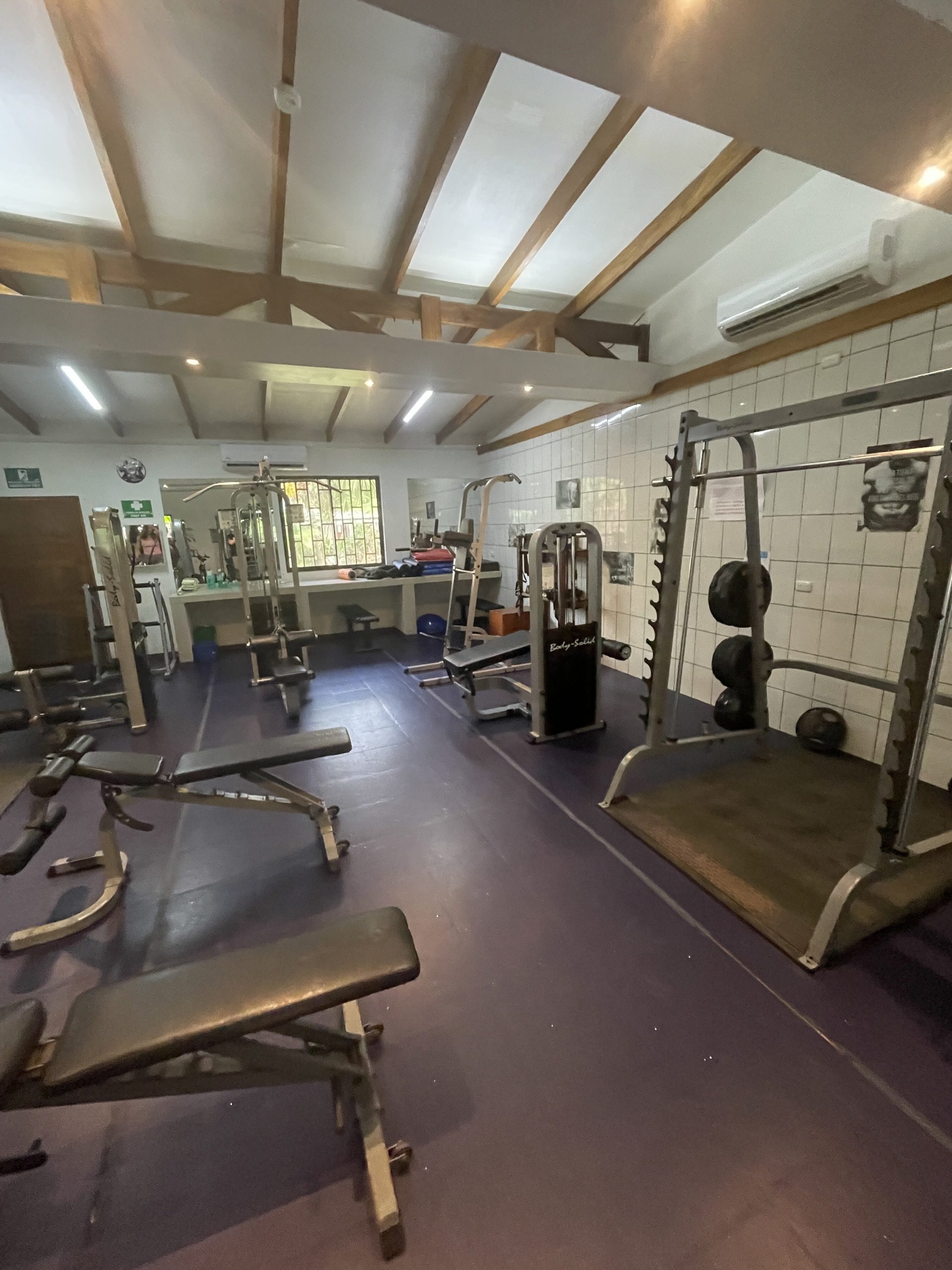 The Caribbean Fitness gym, located in Limon Province Puerto Viejo de Talamanca, a one-hour drive from Gandoca. Van transportation will be provided to the gym. A small room inside has AC with basic functional workout machines including kettlebells and dumbbells.
